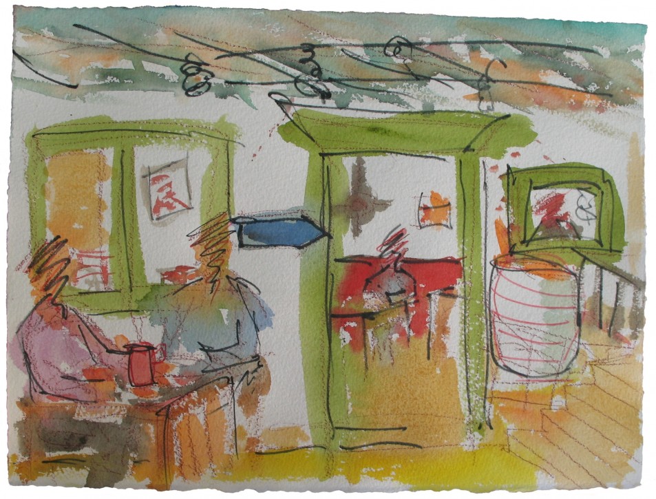 Watercolor sketch of Miles Davis, from his electric period. It may be Keith Jarrett at the keyboards in the background.