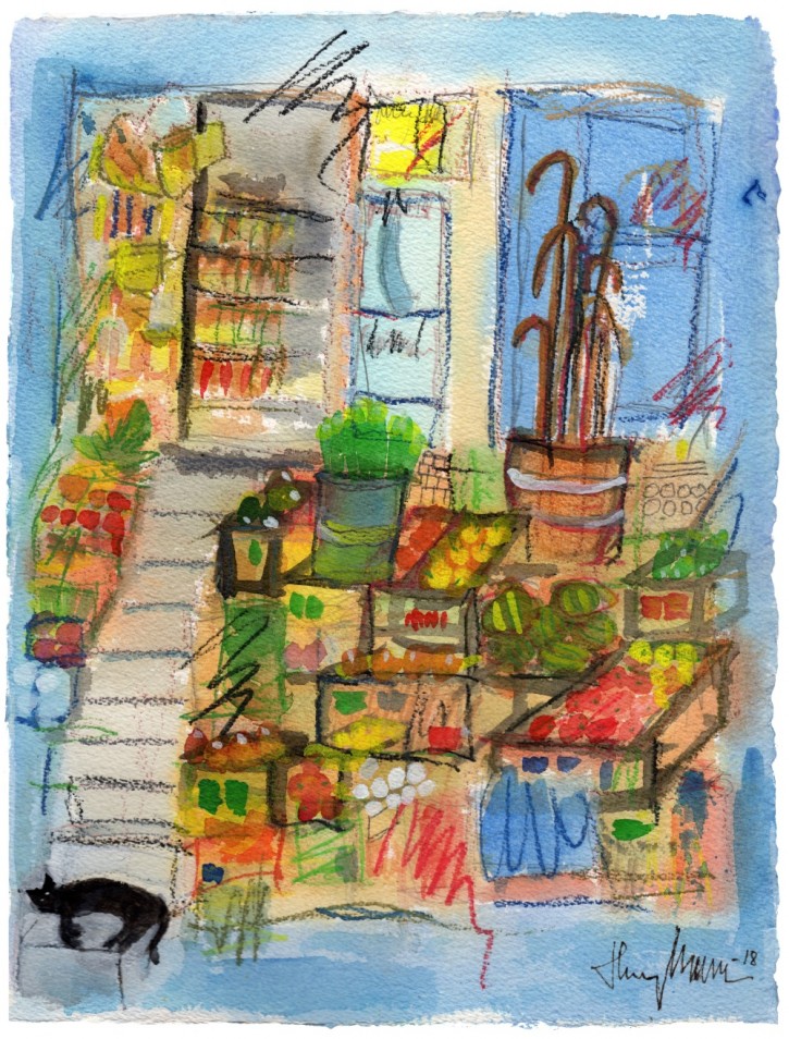 From memory, my take on Mr. Koukoudakis' grocery store, on the street leading down to the port. Today the shop is run by the family and still a beautiful place but more modern. I remember we bought our first lemon tree here, twenty years ago. Koukoudakis delivered it on his boat from the mainland.