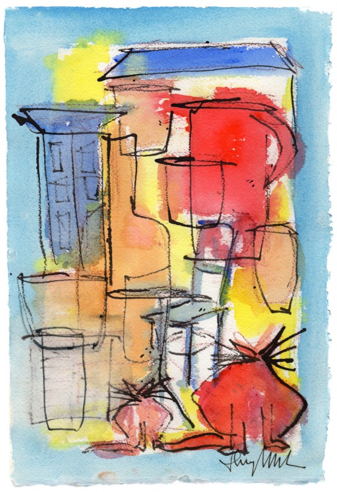 One more somewhat abstract painting I did on Hydra last month, with some Greek colors. And the man walking to the ferry with his suitcase. Why didn't he let a donkey carry the heavy suitcase?