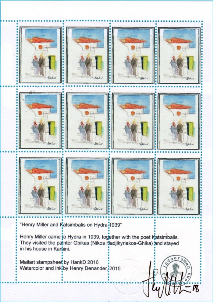 A mailart stampsheet with my painting of Henry Miller and the poet Katsimbalis visiting the painter Ghikas on Hydra in 1939.